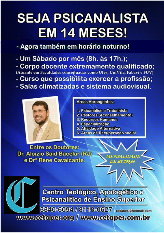 Nova turma do CETAPES de Psicanálise Clínica para Outubro/2013 agora também no horário noturno. Serão apenas dois encontros mensais de !9 às 22 horas. O curso do CETAPES te possibilita clinicar profissionalmente na área respaldando-o a abrir inclusive um consultório para atendimento profissional. Nosso corpo docente é formado por Mestres e Doutores (Formação acadêmica) na área, tendo a Renê Cavalcanti como referência no Espírito Santo e o Dr. Aloísio Said Bacelar referência Nacional.