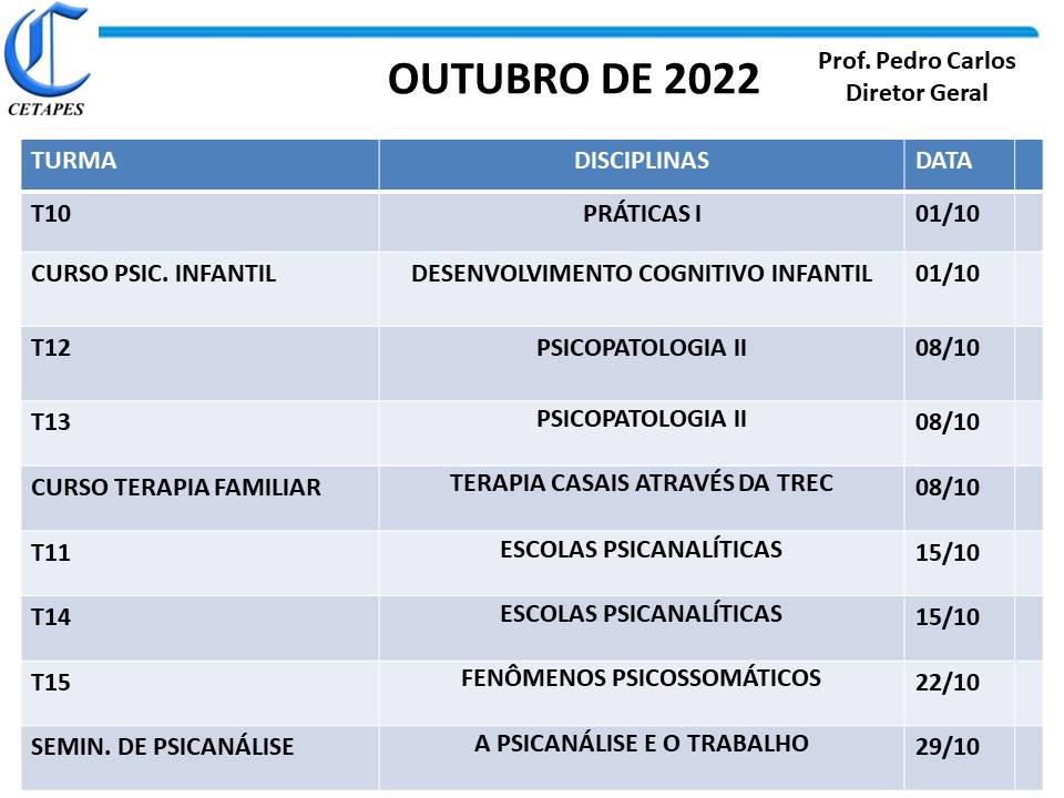 CRONOGRAMA OUTUBRO 22 Compartilhe isso: Compartilhar no X(abre em nova janela) 18+ Compartilhar no Facebook(abre em nova janela) Facebook Curtir Carregando...