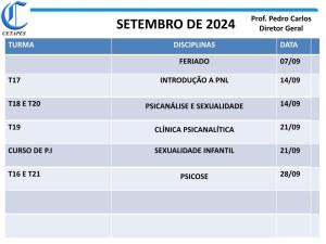 CRONOGRAMA SETEMBRO.pptx (2) Compartilhe isso: Compartilhar no X(abre em nova janela) 18+ Compartilhar no Facebook(abre em nova janela) Facebook Curtir Carregando...
