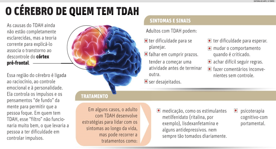 O Transtorno do déficit de atenção e hiperatividade (TDAH), segundo a Associação Brasileira do Déficit de Atenção (ABDA) é uma alteração neurobiológica de origem genética, que pode ter início na infância, sendo capaz de permanecer por toda a sua vida. Ele se tipifica pelos os sintomas de desatenção, inquietude e impulsividade. O transtorno é mais frequente em crianças e adolescentes, segundo apontado pelo Manual diagnóstico e estatístico de transtornos mentais (DSM-5). Ele ocorre na maioria das culturas com percentual de 5% nas crianças e 2,5% nos adultos aproximadamente, sendo que, a mais da metade dos casos o transtorno permanece até a vida adulta.